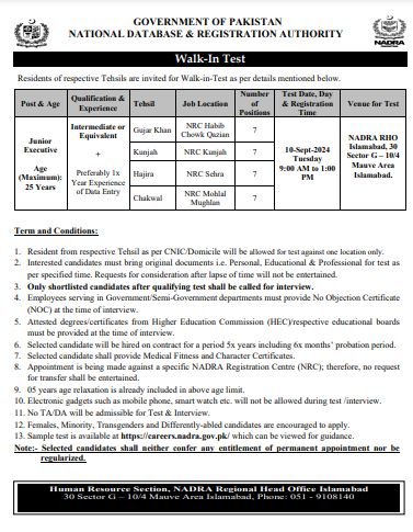 Junior Executive Jobs in NADRA September 2024